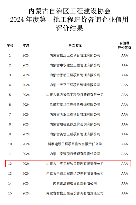2024-07-3015529 次近期,我公司參加內(nèi)蒙古自治區(qū)工程建設(shè)協(xié)會(huì)組織的“2024年度第一批工程造價(jià)咨詢企業(yè)信用”申報(bào),獲得“信用AAA級(jí)證書(shū)”。我公司成立多年以來(lái),遵循中國(guó)工程造價(jià)管理協(xié)會(huì)對(duì)造價(jià)咨詢企…